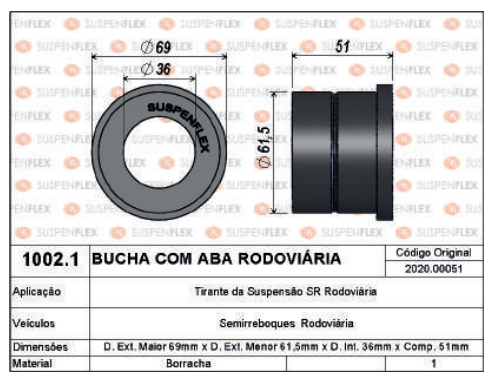 A Bucha com Aba Rodoviária 1002.1 é desenvolvida para aplicações em suspensão de implementos rodoviários, oferecendo excelente absorção de impactos, estabilidade e maior segurança no conjunto. Seu design com aba proporciona melhor fixação e encaixe, garantindo maior eficiência no funcionamento da suspensão.