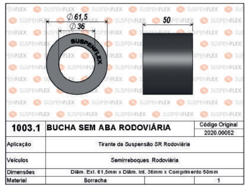 A Bucha Sem Aba Rodoviária 1003.1 é desenvolvida para aplicações em suspensão de implementos rodoviários, oferecendo excelente absorção de impactos e maior estabilidade ao conjunto. Fabricada em borracha de alta qualidade, proporciona flexibilidade e resistência ideais para suportar as exigências do uso contínuo.